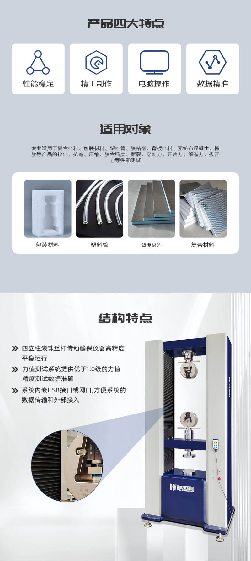 金屬材料萬能拉力機適用于復(fù)合材料、包裝材料、塑料管、膠粘劑、背板材料、無紡布、混凝土、橡膠等高強度非金屬材料和醫(yī)療器械、線纜、鋼材等金屬產(chǎn)品的拉伸、抗彎、壓縮、膠合強度、撕裂、穿刺力、開啟力、解卷力、拔開力等性能測試。